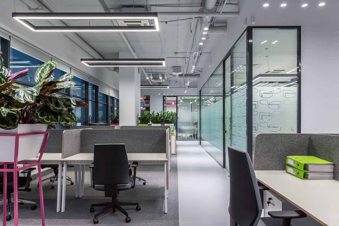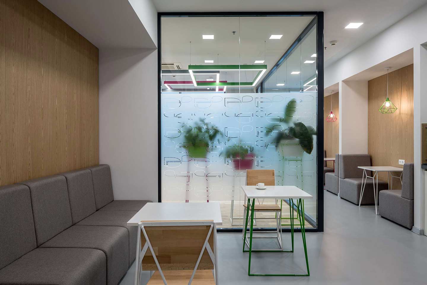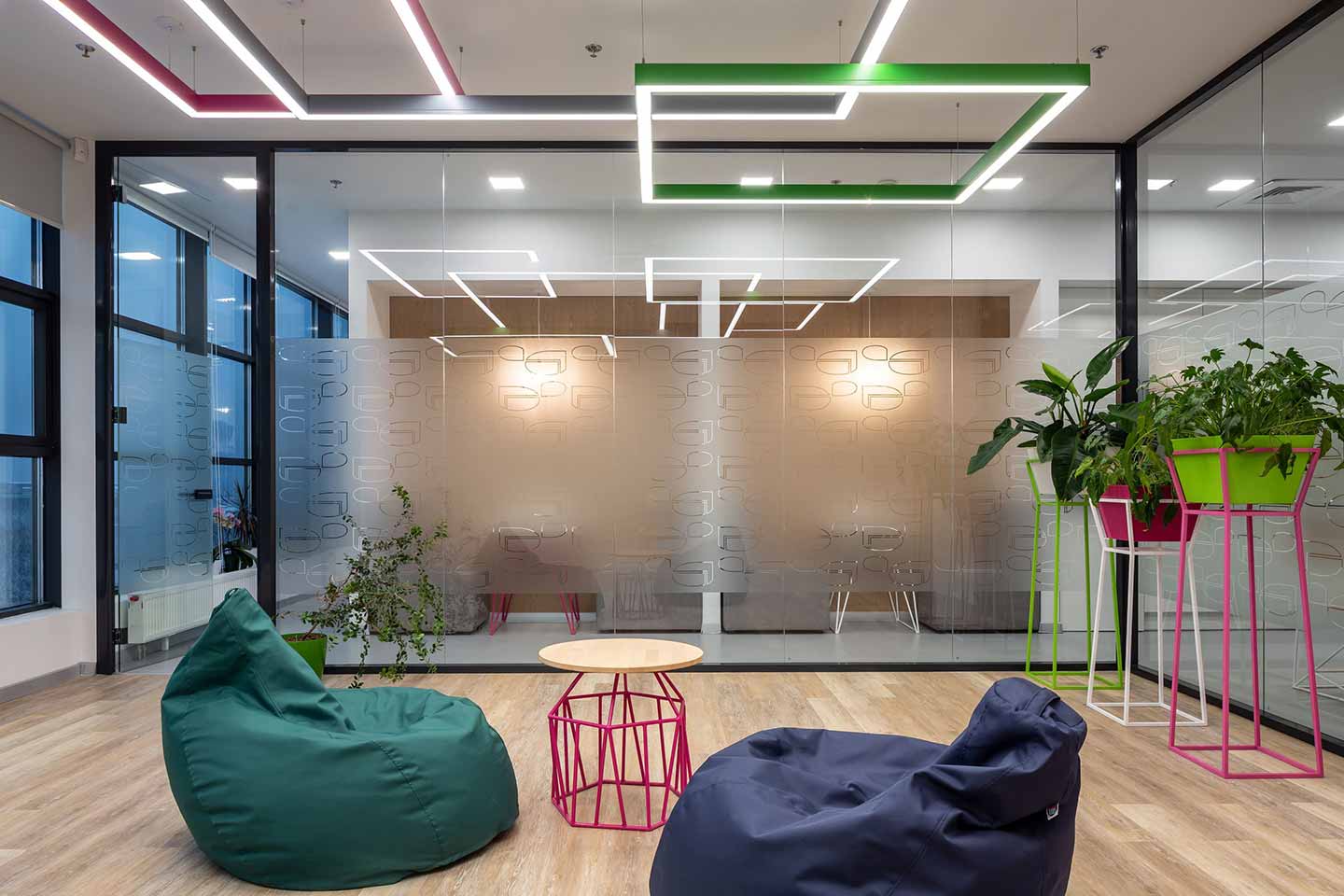 Офіс компанії виконаний відповідно до її фірмового стилю. Ресепшн, окремі кімнати і навіть меблі зроблені так, щоб підкреслити кольори компанії.