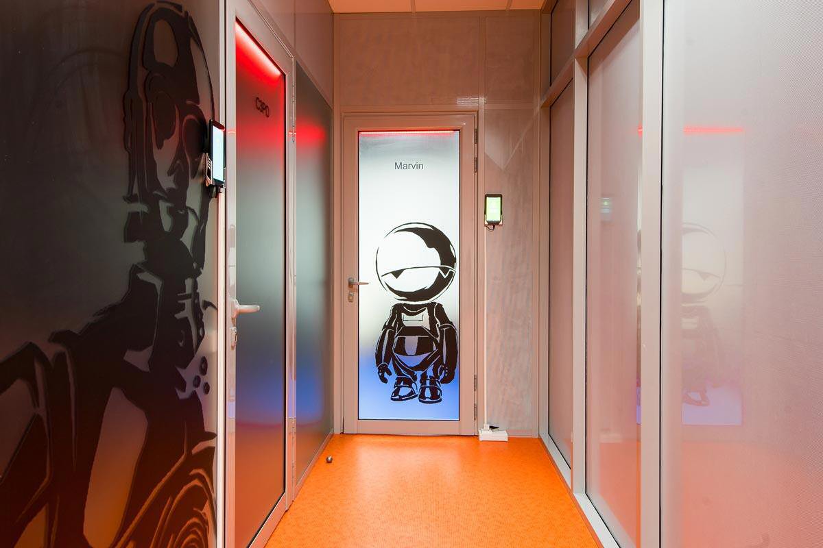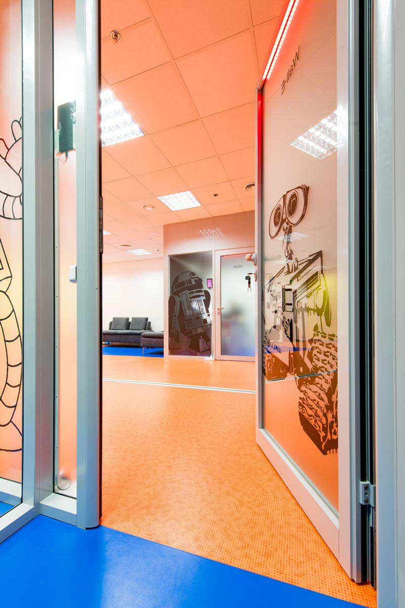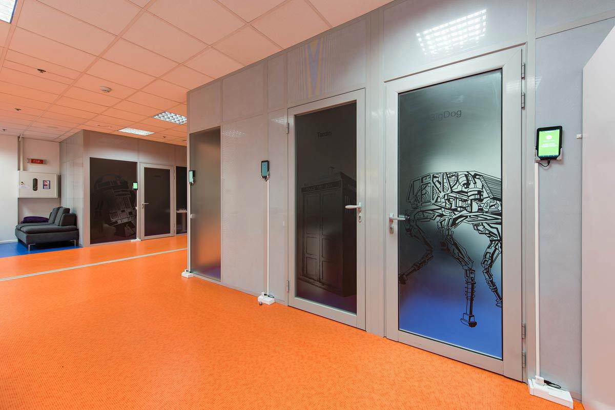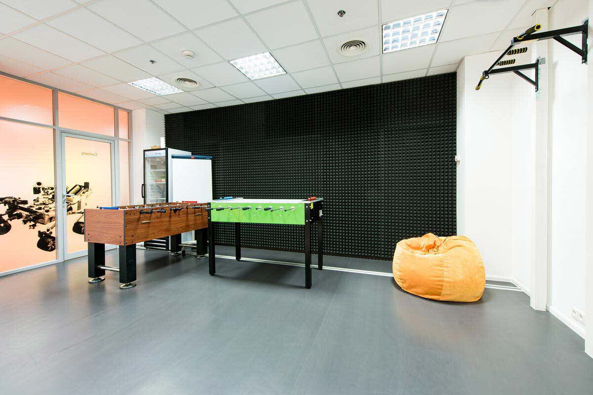 Окрему увагу було приділено шумозаглушенню в переговорних приміщеннях та інших зонах підвищеної гучності. Ізоляція від шуму була проведена за допомогою акустичних панелей. Скляні перегородки були реалізовані з декоруванням на тему робототехніки. Офіс має просторі зони відпочинку, які дуже поширені в сучасних IT компаніях.