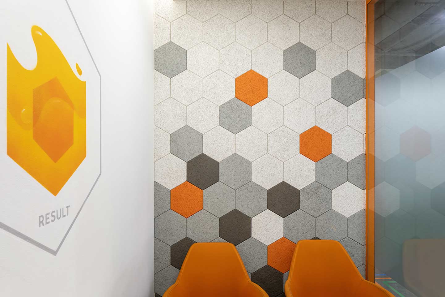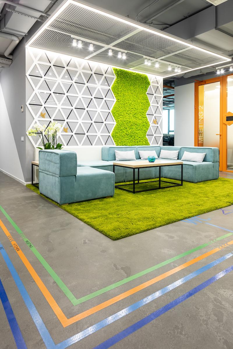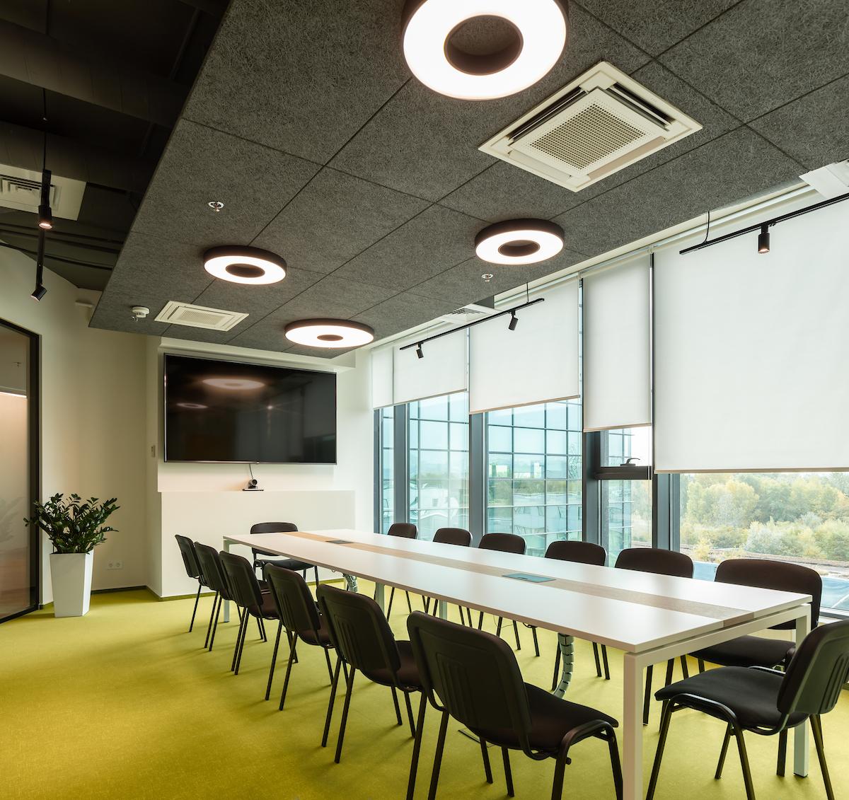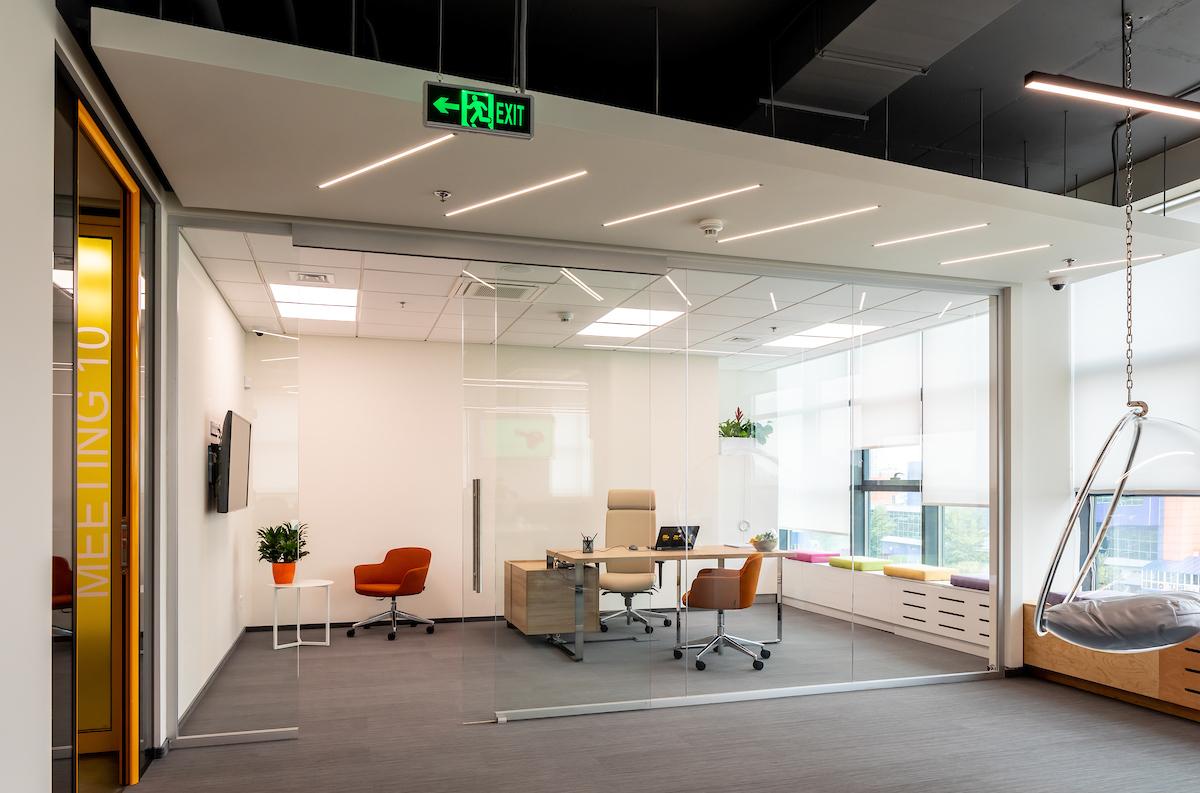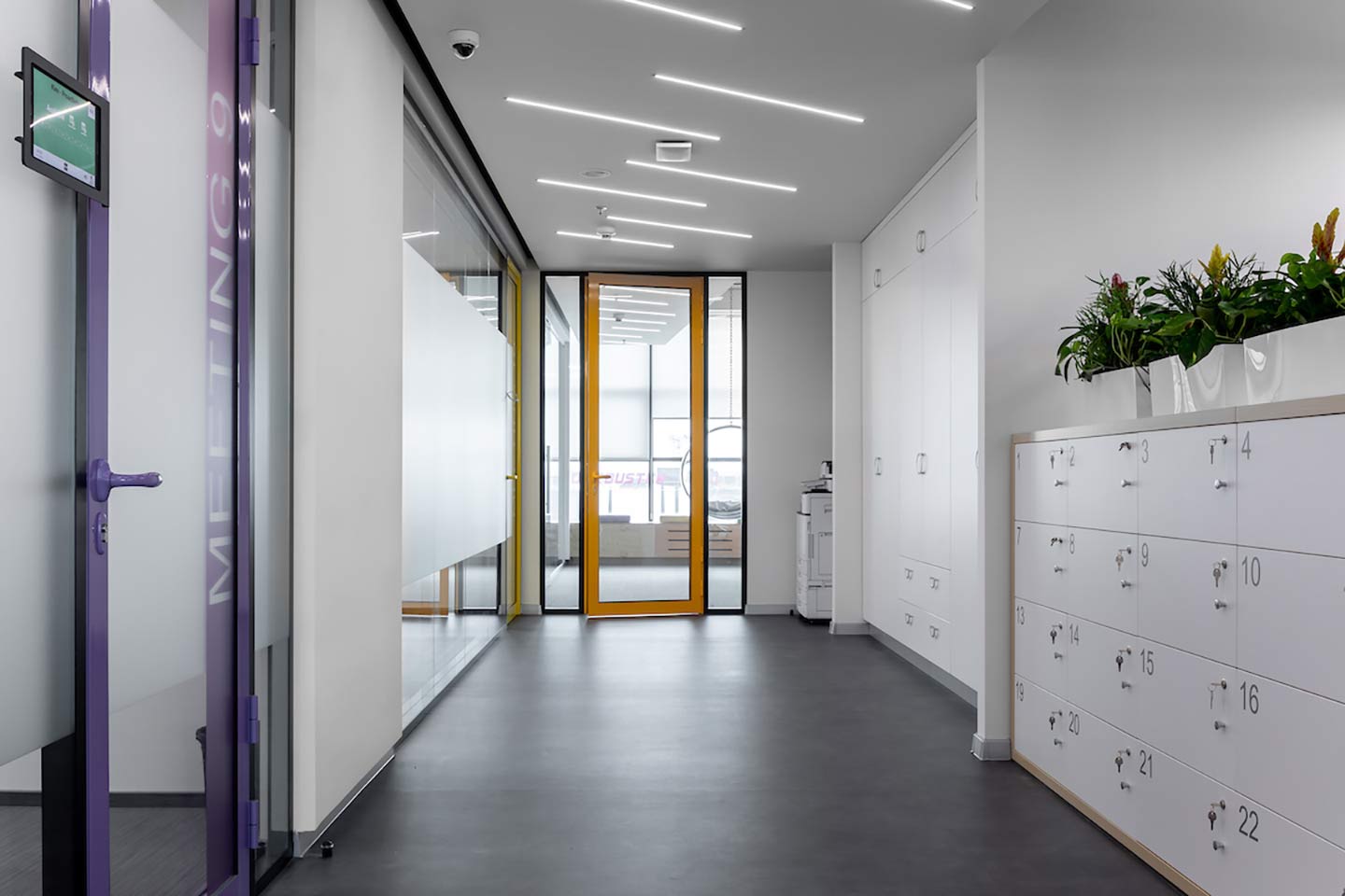Переговорні кімнати були виділені алюмінієвими перегородками, вифарбуваними в яскраві кольори. В них реалізовані спеціальні акустичні рішення для комфортного спілкування. Для підлоги було використано килимового покриття Flotex. Flotex поєднує у собі практичність гнучкого підлогового покриття з протиковзними і акустичними якостями, що звичайно є в текстильних покриттях. Flotex – зносостійкий і гіпоалергенний матеріал. Не боїться води та є єдиним текстильним покриттям, яке можна мити. Ми використали всі матеріали з підвищеною зносостійкістю, термін експлуатації яких розрахований не менш ніж на 5 років.
