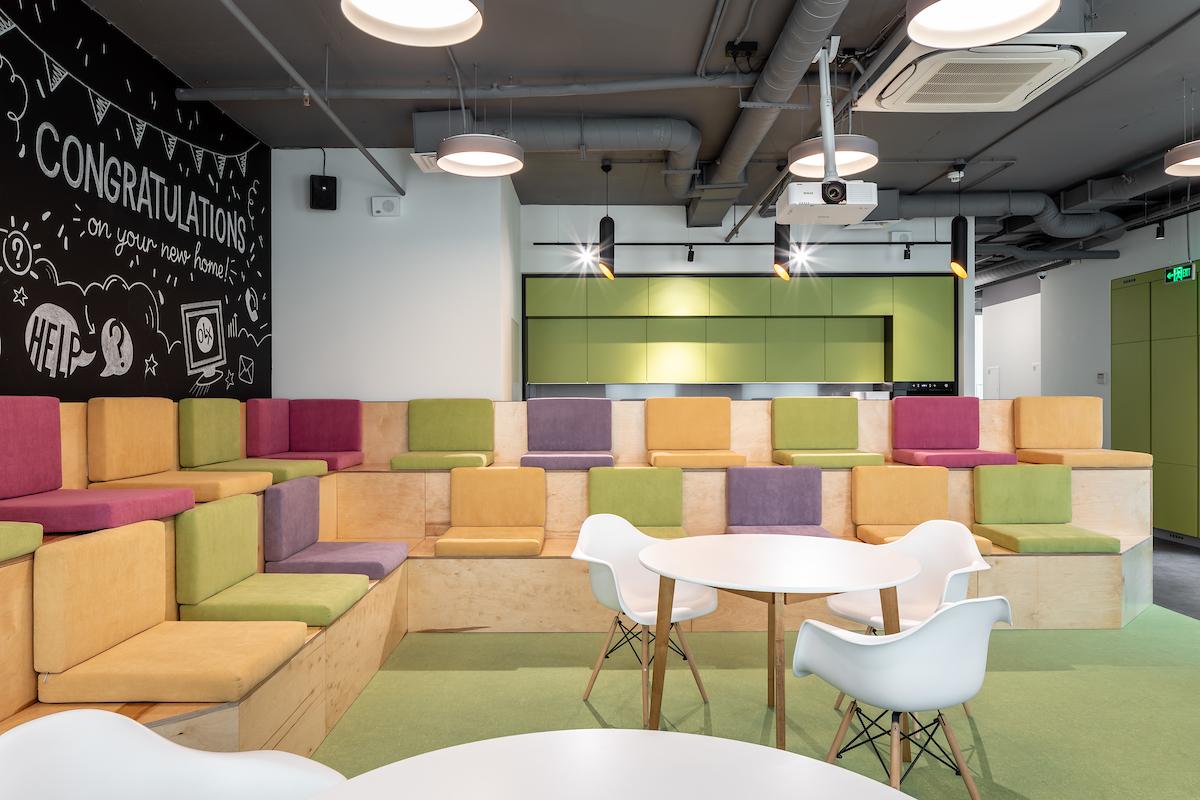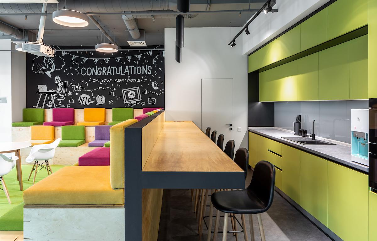 У цьому офісі унікальний дизайн кухні, зона для пиття кави плавно переходить у зону амфітеатру, де збираються співробітники для проведення зібрань, корпоративних івентів, днів народжень. Це універсальне, яскраве і стильне місце, яке часто можна побачити на інста-фото співробітників OLX. Там є ціла стеля, на якій кольоровою крейдою можна реалізувати свої творчі фантазії. Зображення на цій стіні міняються з кожною фазою життя компанії. В офісі величезна кількість зелені.